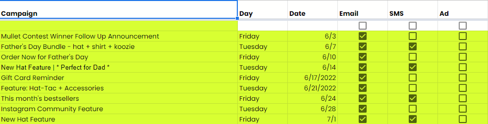 The list is longer than you probably originally thought, and the good news is that you can use a simple Google spreadsheet to keep track of the email + SMS campaigns you're going to send each month, as seen below.