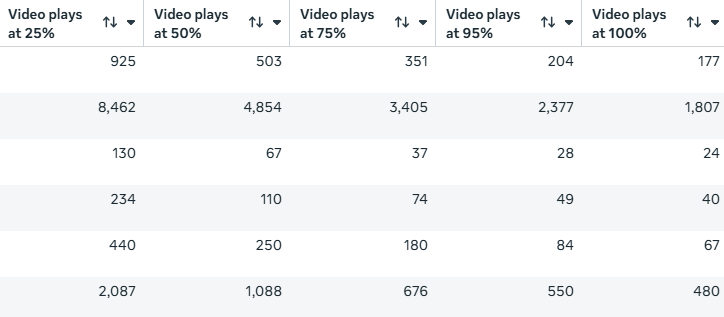 How to measure it: In Meta Ads Manager, go to the ad level and add the video play columns, specifically 25%, 50%, 75%, and 95% video plays. You can customize your columns to show these alongside your other key metrics. Look at each completion stage as a percentage of total impressions to see how far into the video people are actually getting.