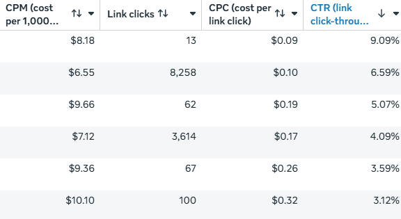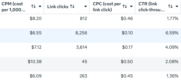 How to measure it: In Meta Ads Manager, customize your columns to add "CPC (Cost Per Link Click),” but make sure you're using the outbound version, not the all-clicks version. All-clicks CPC includes on-platform interactions that never visit your site and will make your CPC look artificially low. You want to know what you're actually paying per website visit. Track this at the ad level so you can compare creative directly against each other rather than looking at blended numbers across a whole campaign.